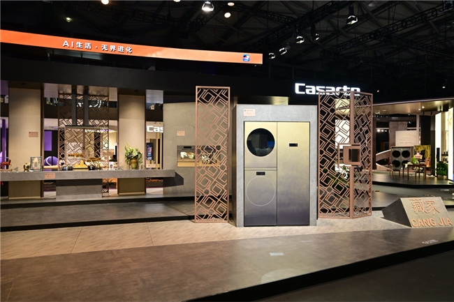 穿过人群继续往前,就看到了卡萨帝20周年限定纪念款高奢艺术家电——藏家套系。这套家电汲取了东方哲学中“藏”的智慧,让家电不再只是工具,更是值得收藏的艺术品。以典藏色“天锦铜”定调,围绕仪表、飨宴、饮食三大生活之礼,构建了三大AI生活场景:洗衣机为高端面料构建洗烘护智慧闭环,冰箱支持氮氧智控锁鲜,烟机的AI智感净化、灶具的AI守护、烤箱的AI智感烹饪可以高效准备一桌佳肴,让家族的味觉记忆在一代代人的舌尖上延续。