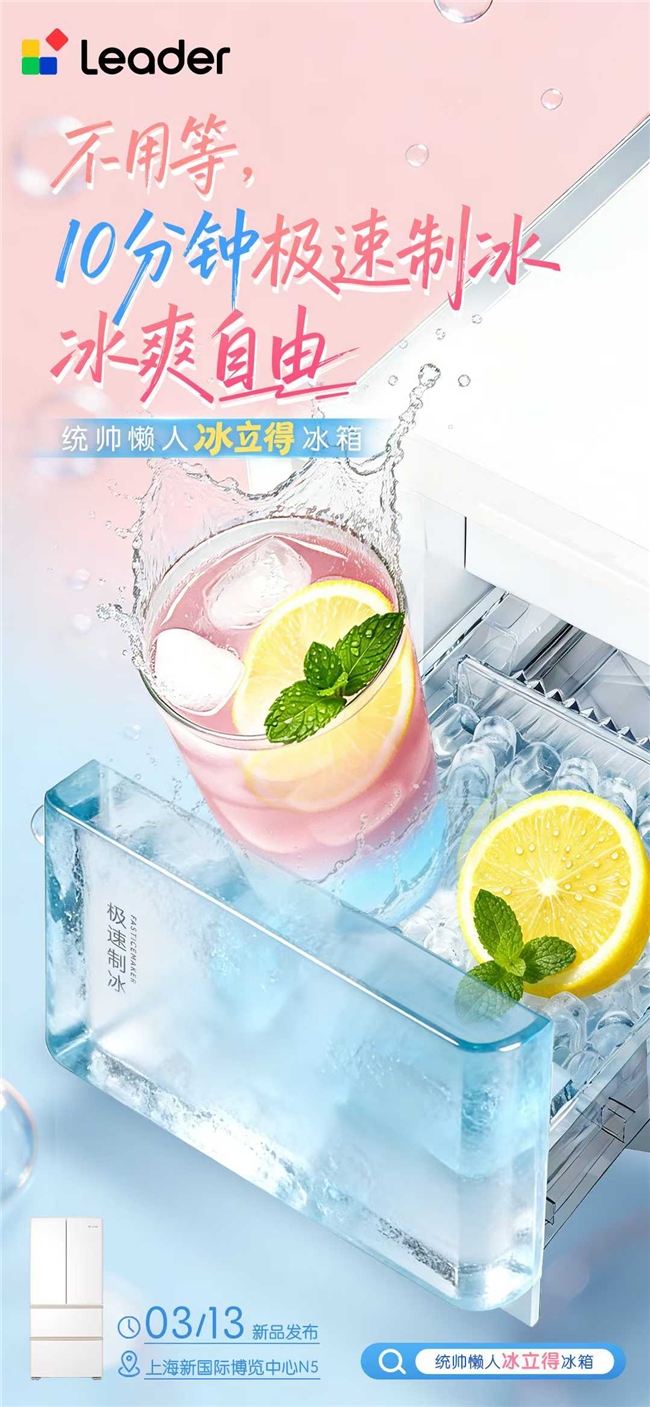 据了解,即将登场的Leader统帅懒人冰箱,10分钟极速制冰,精准戳中了当代年轻人“万物皆可冰”的个性化需求。市场数据显示,冰杯销量连续两年暴涨300%,对于热衷于冰饮、调酒的年轻一族来说,制冰功能已从“加分项”升级为“硬刚需”。