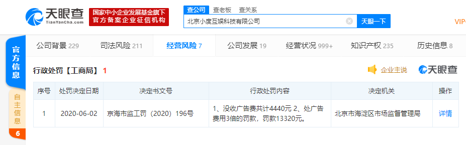 天眼查数据显示,近日,北京小度互娱科技有限公司新增一条行政处罚信息,违法行为类型为广告经营者、广告发布者明知或者应知未经审查,广告主擅自发布医疗、药品、医疗器械、农药、兽药和保健食品广告,以及法律、行政法规规定应当进行审查的其他广告,仍设计、制作、代理、发布的进行处罚。处罚内容为:没收广告费共计4440元,处广告费用3倍的罚款,罚款13320元。处罚决定日期为2020年6月2日,决定机关为北京市海淀区市场监督管理局。