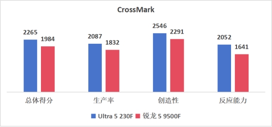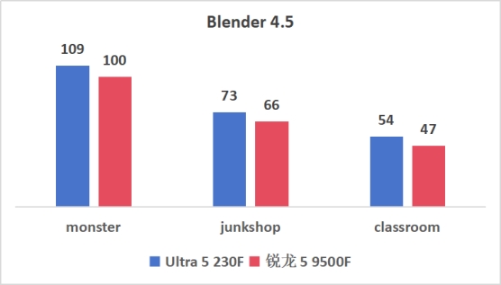 生产力测试比较反应处理器在实际生活中在进行渲染建模,图片与视频制作时的性能。230F拥有更多的核心,成绩也更好。V-Ray是3D渲染程序,230F可以领先9500F6%左右。Blender的三项环境渲染基准测试中,230F平均领先幅度高达11%。CrossMark是一项综合的基准测试软件,覆盖绝大多数使用场景,230F领先9500F 16%左右。