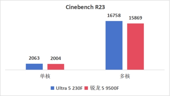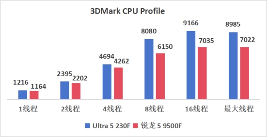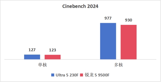 接下来我们来看几项理论测试以及生产力测试,在Cinebench R23测试中,单核性能上230F领先9500F 2.9%,多核性能上领先5.6%。Cinebench 2024中也有类似表现,单核性能230F领先3.2%,多核领先5%。在3DMark CPU Profile中,差距还要明显,单线程领先2.4%。最大线程领先28%。