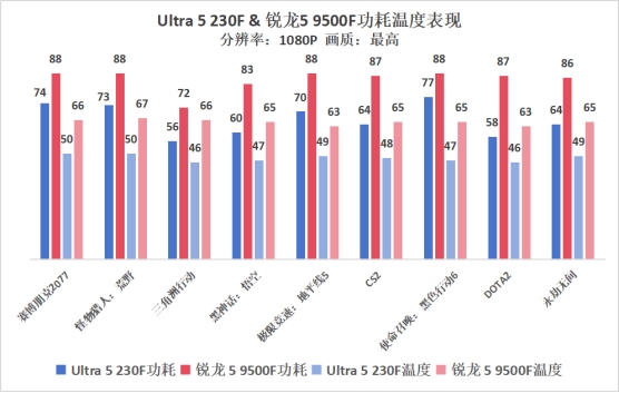 在游戏测试中我们还额外记录了其功耗和温度表现,Arrow Lake架构最显著的提升就是其能效比,在保证游戏性能不变的情况下降低40%功耗,游戏平均功耗约为66W。9500F虽然有88W功耗墙但是其架构原因导致的积热问题还是存在的。温度也基本在65度上下,比230F高了15度还多。