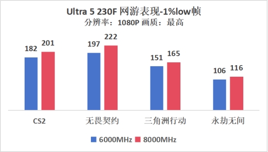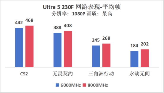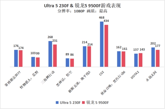接下来是游戏测试,统一在1080P分辨率,最高画质下进行,有基准测试的游戏都会运行基准测试,无基准测试的则会在固定地图中进行固定路线跑图。在测试的9款游戏中,230F7胜1平1负。《极限竞速:地平线5》上两款处理器帧数表现相同,《DOTA2》中落后4%。在剩下来的七款游戏中,《赛博朋克2077》和《使命召唤:黑色行动6》中领先幅度在1%左右。其中非常火热的《三角洲行动》领先幅度最大高达16%。整体上230F领先9500F 4.7%左右