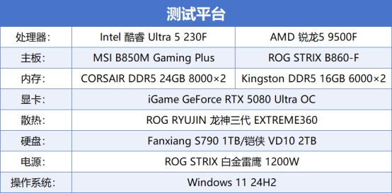 我们搭建了如下配置的两套测试平台,考虑到处理器的定位,两套主机都是使用了B系列的主板,Intel这边是微星的B850M,AMD这边是ROG B860-F都是新一代的主板。为了避免显卡瓶颈,显卡使用了RTX 5080。内存方面,Intel组使用了两条24GB 8000频率的DDR5内存,AMD则是两条DDR5 16GB 6000的。230F原生支持6400MT/s并且支持CUDIMM内存,开启XMP后可轻松来到8000+MT/s,后续我们也会测试6000MT/s和8000MT/s的内存对网游的影响。而AMD这里内存支持仅为5600MT/s,在高频内存的兼容性以及性能表现上是不及Intel的。