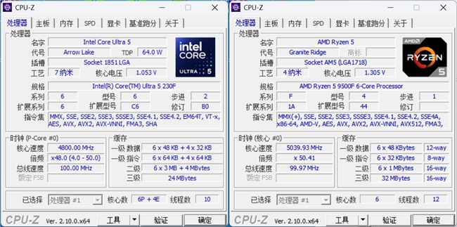 AMD锐龙5 9500F则是采用Zen 5架构,拥有6核12线程,基础频率为 3.8 GHz,最大加速频率 5.0 GHz,L3缓存32MB。综合来看,Ultra 5 230F的核心更多,制程工艺更先进,整体的架构上的异构设计也是Intel这边更利于散热更具有能效比,两者最大频率相同,基础频率是9500F要高一些。目前价格也是Ultra 5 230F要更便宜一些,毕竟一个是新出的,一个是半年前的,当然了解AMD处理器的玩家也太会冲首发购买,价格是一定会跳水的。