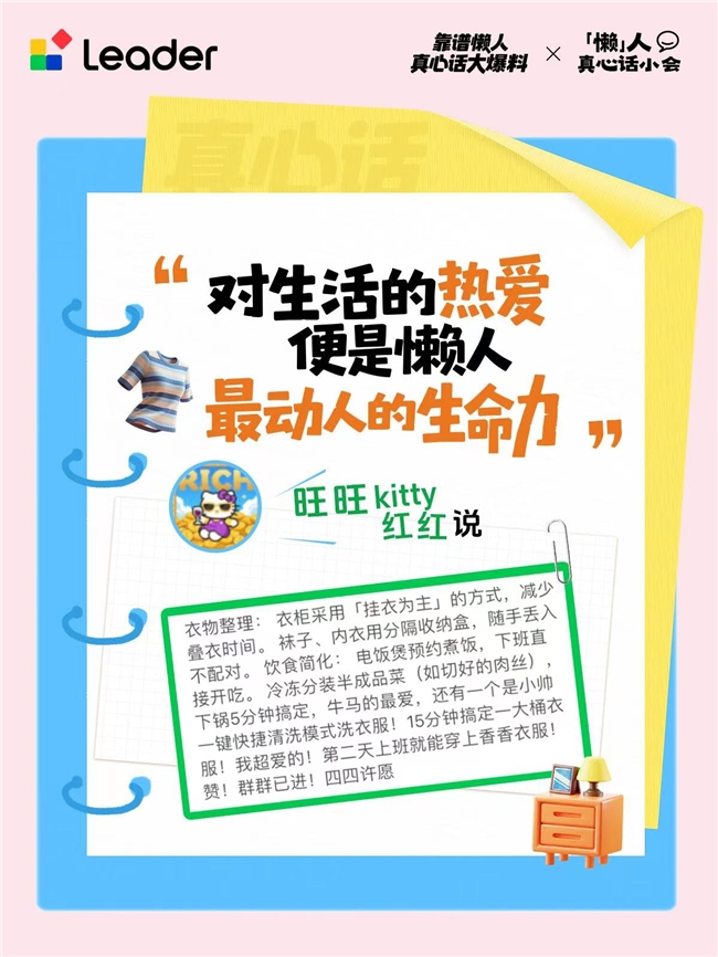 在年轻人的语境中,“懒”往往意味着对效率的极致追求。统帅率先洞察到了年轻人对“精致懒”的需求,通过“「懒」人真心话小会”等趣味互动,邀请年轻人来评论区说出自己的懒人智慧、懒人槽点,每一个想法和脑洞,都会被统帅团队视若珍宝。
