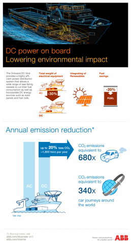 ABB的船载直流电网于2011年5月推出,体现了直流电解决方案的再次流行,并且将为多种船舶提供高效配电和电力推进。该解决方案专为拥有低压船载电路的船舶设计,例如海上支援船、拖船、渡船和快艇,并且可以使燃料消耗和排放减少20%。