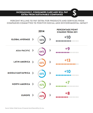 纽约--(美国商业资讯)--尼尔森的一项最新研究显示,来自 60个国家55%的全球在线消费者表示,愿意对带来积极社会和环境影响的企业提供的产品和服务支付更高价格。其中,亚太(64%)、拉美(63%)和中东/非洲(63%)购买履行社会责任品牌产品的倾向最强烈。北美和欧洲的此项数据分别为42%和40%。