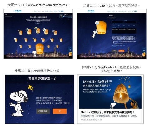 步驟一:前往www.metlife.com.hk/dreams。 步驟二:在140字以內,寫下您的夢想。 步驟三:登記免費財務狀況分析。 步驟四:分享至Facebook,鼓勵朋友投票,支持您的夢想!(圖片:美國商業資訊)