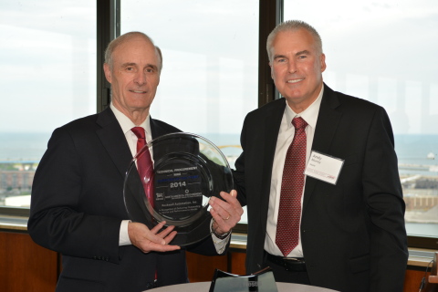 罗克韦尔自动化董事长兼首席执行官Keith Nosbusch接受雀巢技术采购主管Andy Murray授予的2014年度北美采购供应商奖,该奖肯定了罗克韦尔自动化在技术采购、维护、维修和操作(MRO)方面的能力。(照片:美国商业资讯)