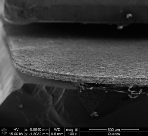 Edge of Enevate’s silicon-dominant anode magnified at 100X. Enevate's self-standing monolithic anode enables Li-ion batteries with both ultrafast charging and high energy density. (Photo: Business Wire)