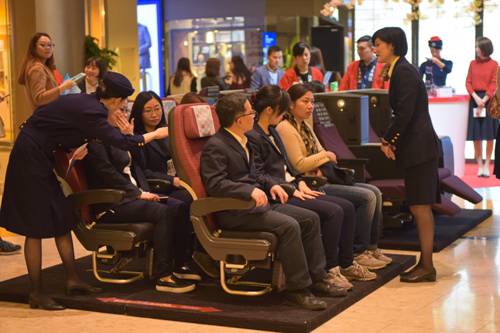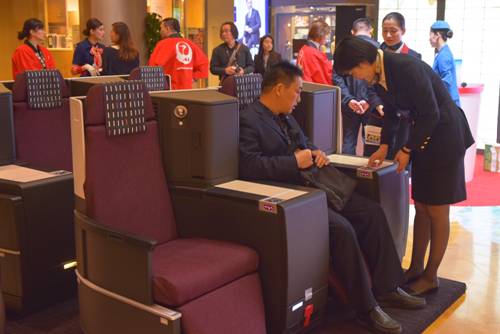 除了浓浓的日式氛围,活动现场还展示了荣获世界最佳设计奖的飞机座椅JAL SKY WIDER,该系列座椅继2013年获颁“航空公司最佳商务舱座椅”后,于2015年2度荣获全球航空公司经济舱最佳座椅评价。凭借增加的7cm座椅间距和更薄的座椅厚度让腿部空间增加了10cm,更是采用折叠桌和充分利用一切可能的空间提供更多的存储空间等等来营造更为舒适的乘坐体验,让更多旅客体验更加放松的空中之旅。