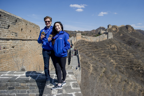 2016年3月25日,美国奥运会金牌得主和Visa之队运动员Meryl Davis和Charlie White,带领由1,000名美国游客组成的代表团攀登了长城金山岭段。Davis和White正与2016年中美旅游年赞助商Visa开展合作,推动中美两国之间的旅游、商业和交流。(照片:美国商业资讯)