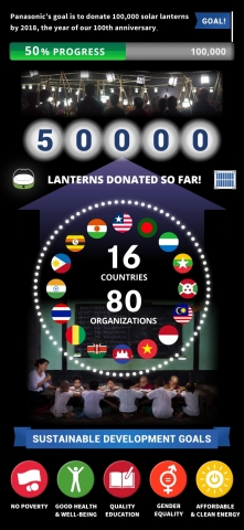 松下将进一步加快10万盏太阳能灯活动的进程,从而使其能够于2018年其成立100周年之际顺利捐赠出10万盏太阳能灯,同时加大力度为实现全球领导人于2015年9月在联合国提出的“可持续发展目标(SDG)”做出贡献。