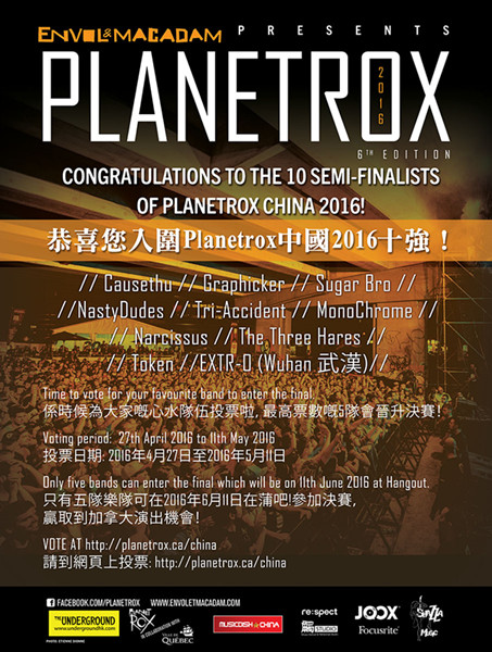 Planetrox中国 2016 第一回遴选已经完毕,现正进入第二回合,共有十队晋级成功,努力继续为九月份迈向加拿大Envol et Macadam 音乐节演出的梦想进发!对于所有乐队而言,这是一个千载难逢的机会!现在就靠你们(观众们)选择那5队乐队能晋升到总决赛。他们的音乐短片已经全部放到网页上接受公开投票,你的一票可以随时改变赛果!