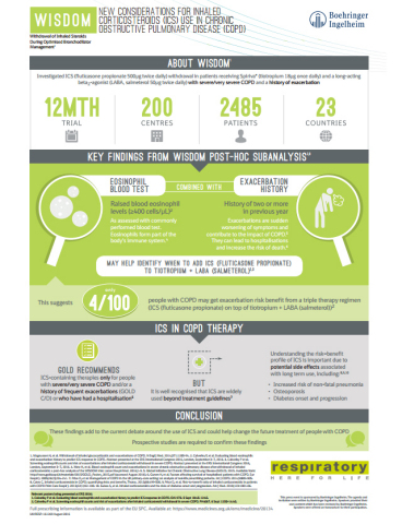 Boehringer Ingelheim today announced a new post-hoc subanalysis of the WISDOM study that suggests only 4 out of 100 people with chronic obstructive pulmonary disease (COPD), who have a history of frequent exacerbations and raised eosinophil levels (≥400 cells/µL), may further benefit by adding inhaled corticosteroids (ICS, fluticasone propionate 500µg twice daily) to Spiriva® (tiotropium 18μg once daily) and a long-acting beta2-agonist (LABA, salmeterol 50μg twice daily) with regard to reducing exacerbation risk.1,3 Eosinophils, which are a type of white blood cell, are assessed as part of a routine blood test.4 This new post-hoc subanalysis was presented today at the European Respiratory Society (ERS) International Congress 2016 in London.